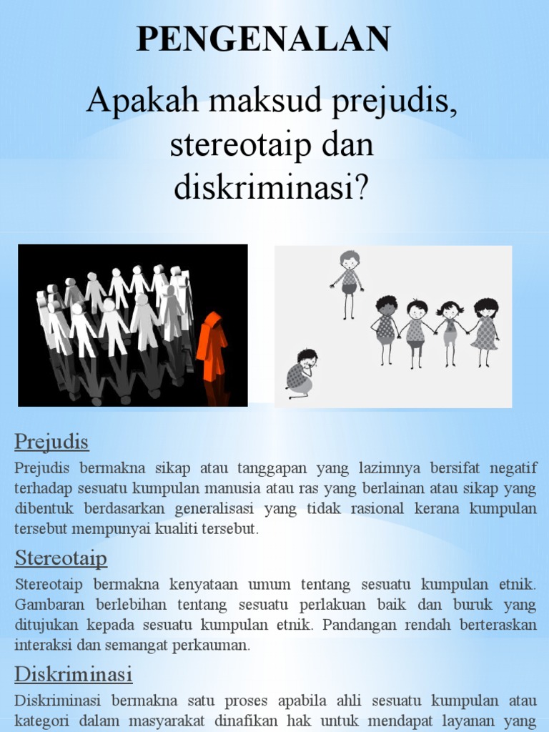 . Prejudis mempunyai bahagian yang dinamakan stereotaip iaitu satu imej. Diskriminasi diskriminasi bermakna satu proses apabila ahli sesuatu kumpulan atau kategori dalam masyarakat dinafikan hak untuk mendapat layanan yang saksama dari segi undang. 16 jenis diskriminasi dan punca.
